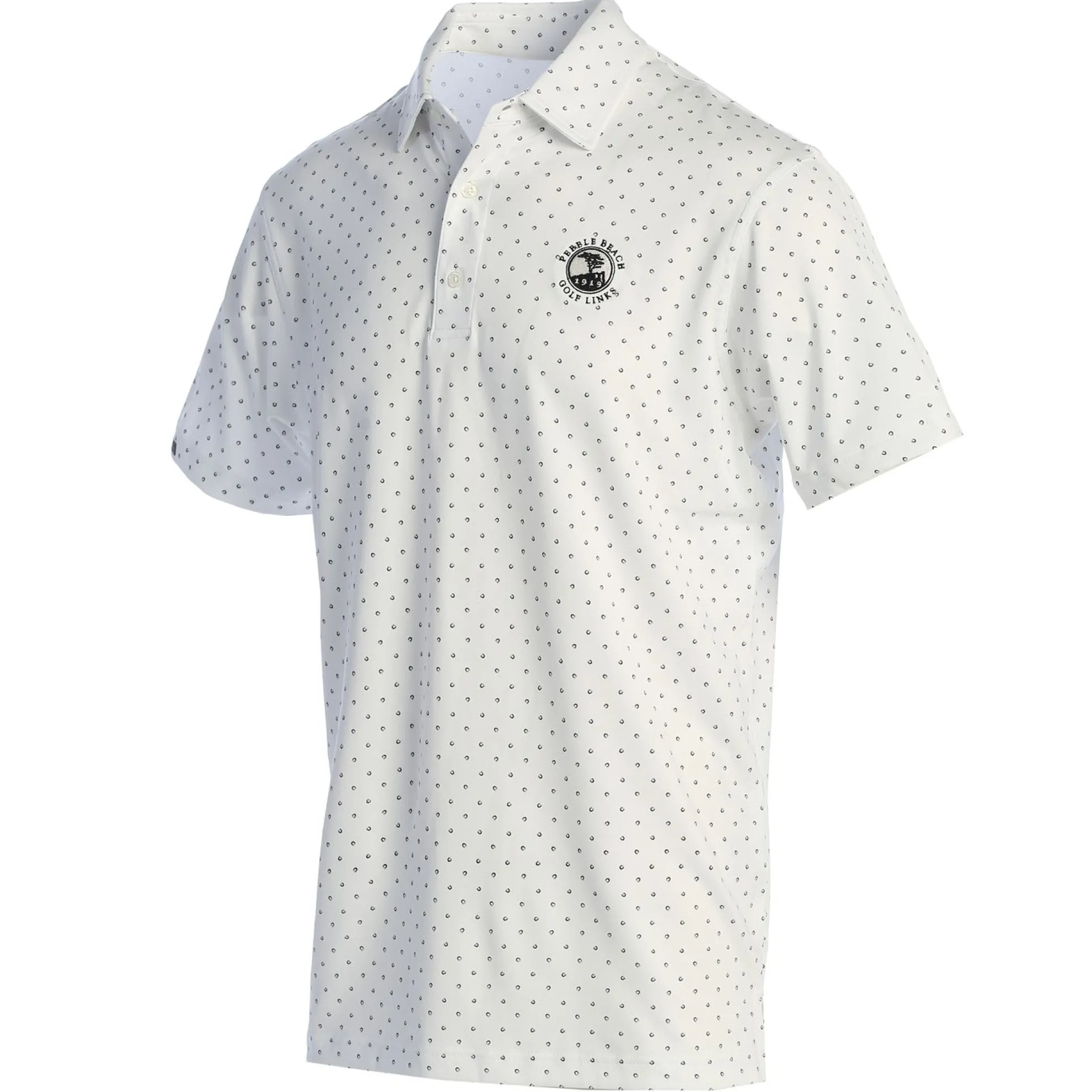 Pebble Beach Signature Dot Performance Polo By DunningLightweight, Moisture-Wicking, Performance StretchSignature D Logo Print47% Coolmax®, 48% Polyester, 5% SpandexRecycled Poly ButtonsSelf CollarUpf 50+