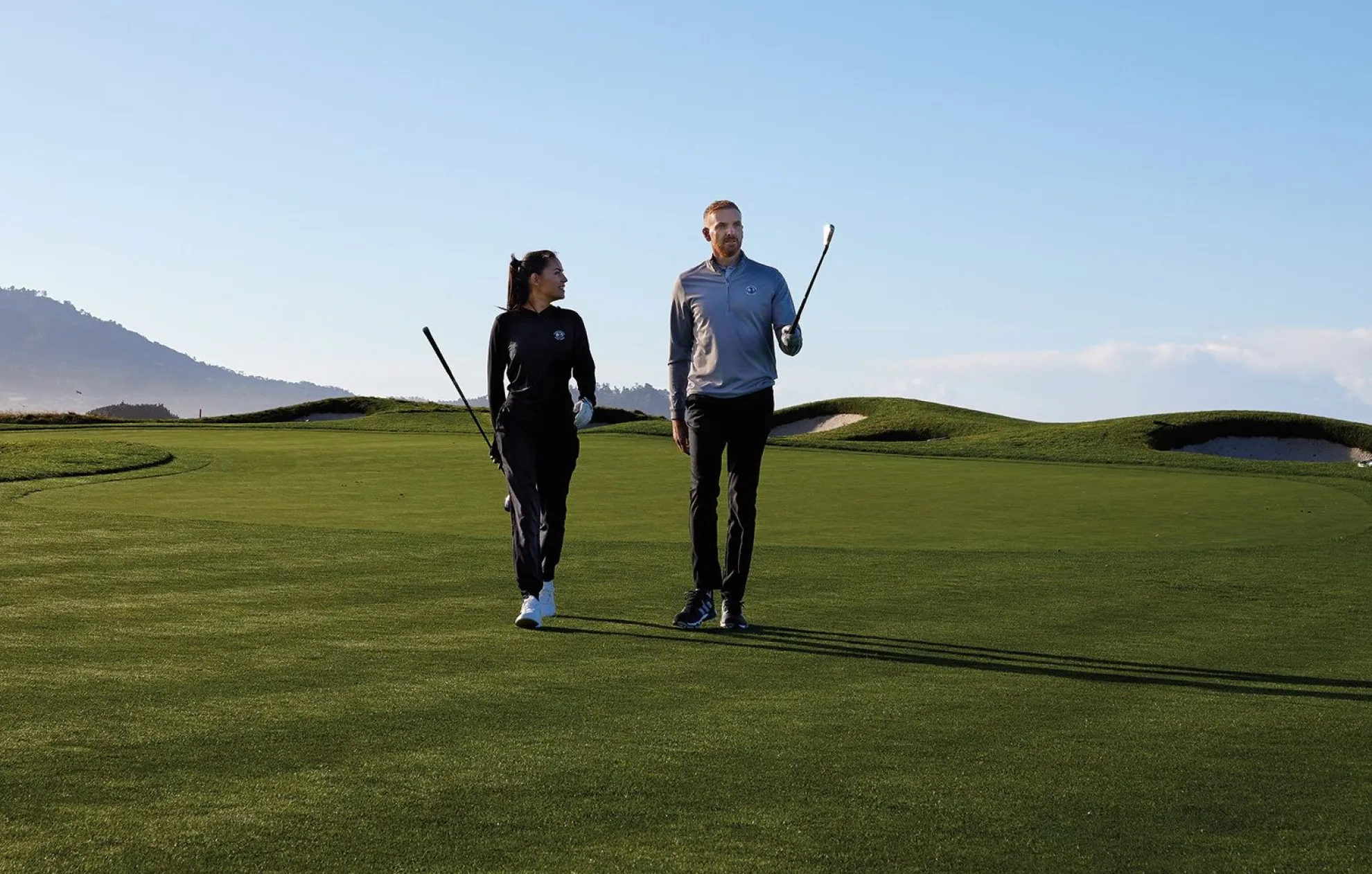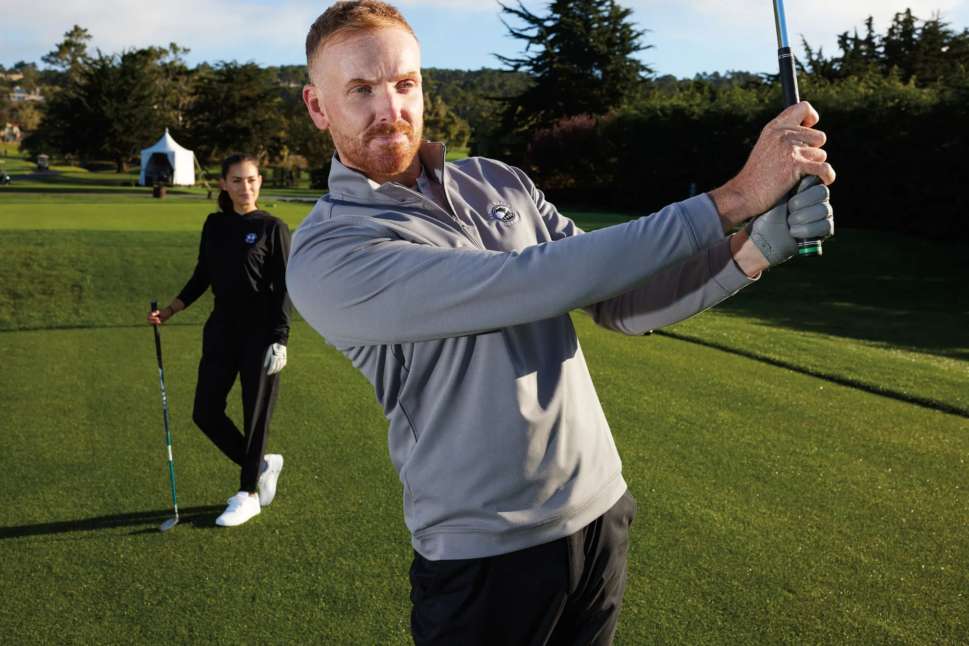 Pebble Beach Men’s 3-Stripes Heather 1/4 Zip By AdidasRegular FitQuarter Zip With Stand-Up Collar53% Cotton, 47% Recycled Polyester DoubleknitSoft Feel