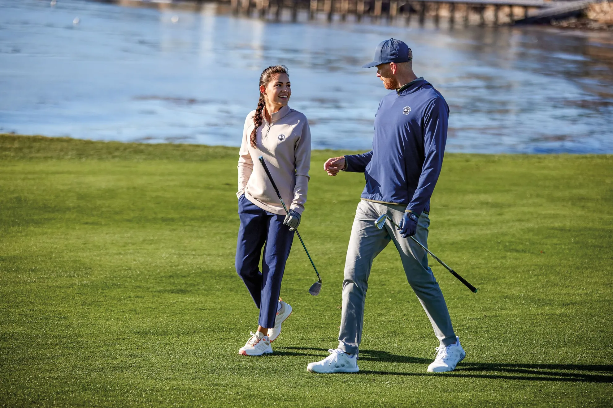 Pebble Beach Women’s 1/4 Zip Knit Pullover By AdidasRegular FitQuarter Zip With Stand-Up Collar91% Recycled Polyester, 9% Elastane Doubleknit